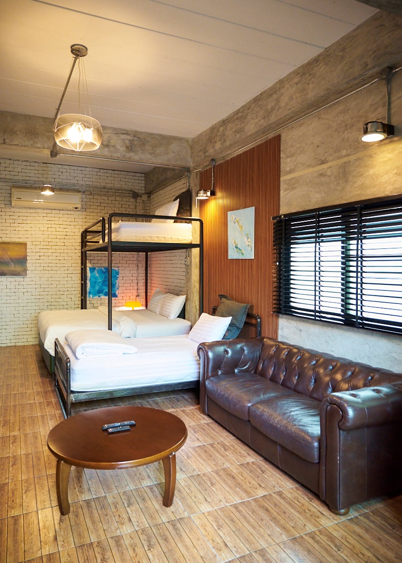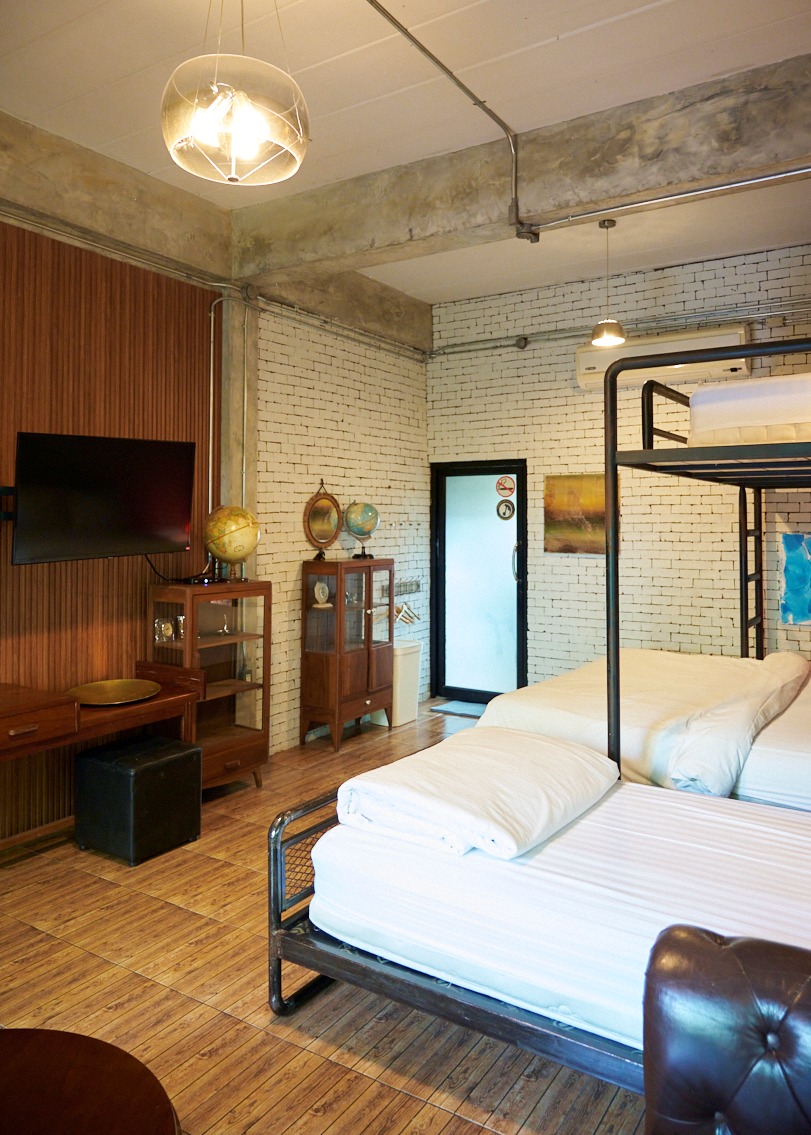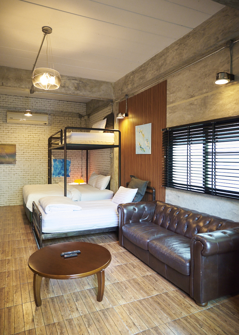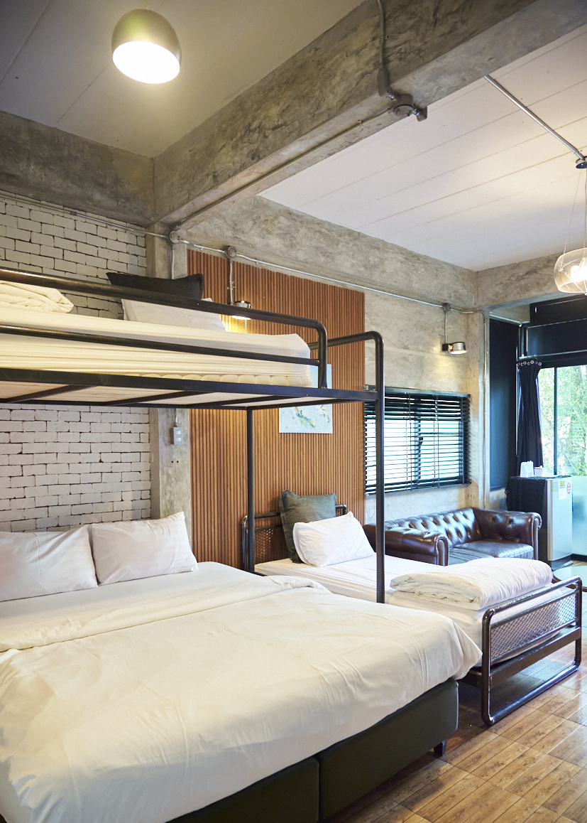 ห้องสีเทา 1 เป็นห้องแฟมิลี่ ขนาด 40 ตรม. อยู่บนชั้น 1 ของอาคาร วิลล่า 2 ห้องพักวิวสระว่ายน้ำ และสวนต้นไม้ ออกแบบมาอย่างสมบูรณ์แบบเพื่อให้ทุกคนในห้องมีความสุขด้วยกัน ห้องพักตกแต่งด้วย Loft Style โทนสีน้ำตาล เทา ดำ ผนังด้านหนึ่งก่อด้วยอิฐมอญ ลักษณะการตกแต่งภายใน โดยจัดวางพื้นที่แบบอิสระปลอดโปร่ง และยังให้ความสำคัญกับการจัดวางสิ่งของภายในตัวอาคาร ด้วยเฟอร์นิเจอร์ต่าง ๆ เพื่อให้แสดงสเน่ห์ของสถาปัตยกรรมสไตล์ Loft ออกมาได้อย่างชัดเจนที่สุด ออกแบบมาเพื่อการพักผ่อน ห้องนี้สามารถรองรับผู้เข้าพักจำนวน 4 ท่าน พร้อมเตียงคิงไซส์ 1 เตียง และเตียง 2 ชั้น 3.5 ฟุต 1 เตียง ห้องพักกว้าง สะอาด เพดานโปร่ง โล่งสบาย.