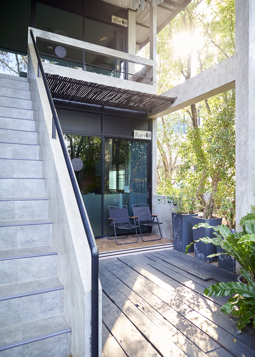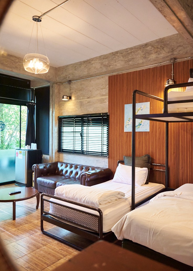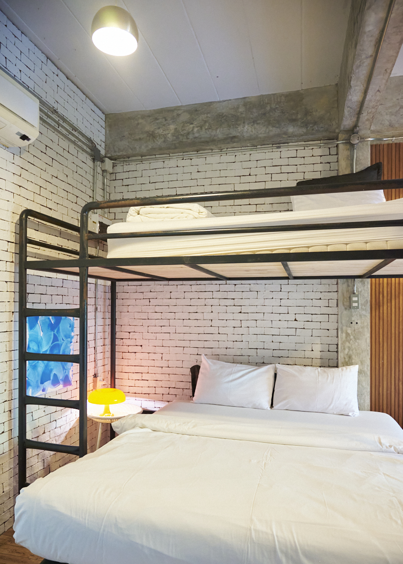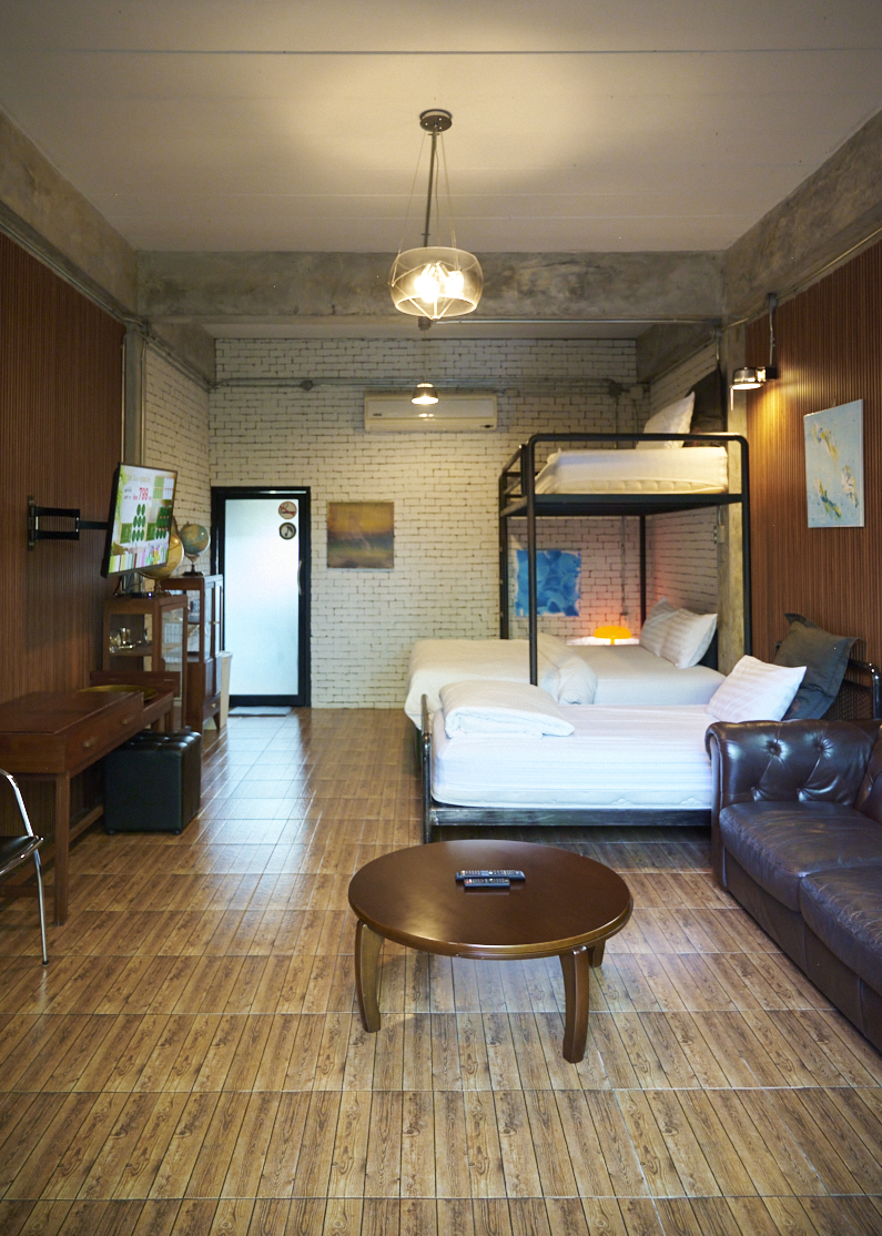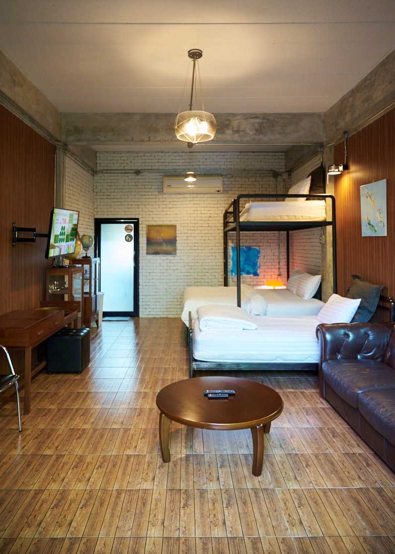 ห้องสีเทา 1 เป็นห้องแฟมิลี่ ขนาด 40 ตรม. อยู่บนชั้น 1 ของอาคาร วิลล่า 2 ห้องพักวิวสระว่ายน้ำ และสวนต้นไม้ ออกแบบมาอย่างสมบูรณ์แบบเพื่อให้ทุกคนในห้องมีความสุขด้วยกัน ห้องพักตกแต่งด้วย Loft Style โทนสีน้ำตาล เทา ดำ ผนังด้านหนึ่งก่อด้วยอิฐมอญ ลักษณะการตกแต่งภายใน โดยจัดวางพื้นที่แบบอิสระปลอดโปร่ง และยังให้ความสำคัญกับการจัดวางสิ่งของภายในตัวอาคาร ด้วยเฟอร์นิเจอร์ต่าง ๆ เพื่อให้แสดงสเน่ห์ของสถาปัตยกรรมสไตล์ Loft ออกมาได้อย่างชัดเจนที่สุด ออกแบบมาเพื่อการพักผ่อน ห้องนี้สามารถรองรับผู้เข้าพักจำนวน 4 ท่าน พร้อมเตียงคิงไซส์ 1 เตียง และเตียง 2 ชั้น 3.5 ฟุต 1 เตียง ห้องพักกว้าง สะอาด เพดานโปร่ง โล่งสบาย.